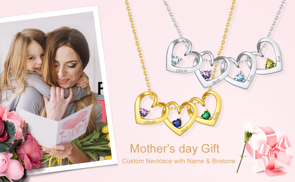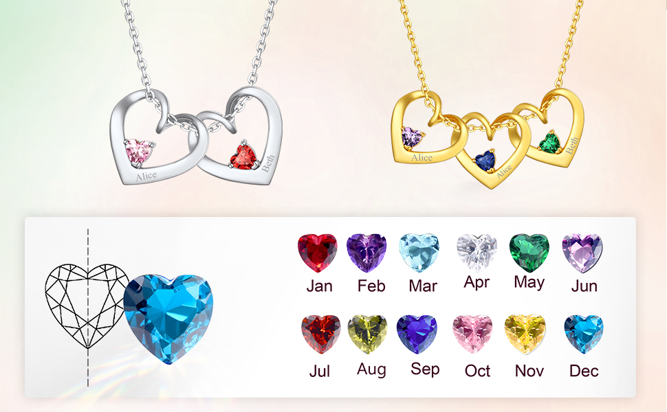 Collier Cœurs avec Prénoms et Pierres de Naissance pour Maman