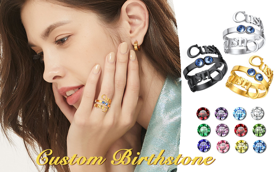 Bague Personnalisée avec Pierre de Naissance et Double Nom : Bague personnalisée en acier inoxydable avec deux pierres de naissance. Gravez la bague avec votre nom, un texte significatif ou une date d'anniversaire, etc. Un cadeau personnalisé parfait pour les femmes ou pour vous faire plaisir, même comme bague commémorative pour montrer votre amour à une personne spéciale sans dire un mot !