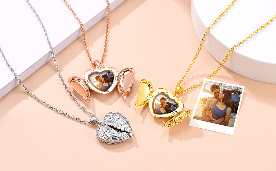Collier Médaillon Cœur avec Ailes d'Ange Personnalisé avec Photo