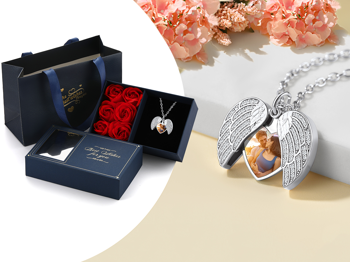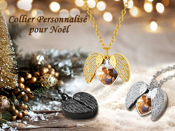 Médaillons personnalisés pour femmes qui contiennent des photos. Collier médaillon ailes d'ange avec photo à l'intérieur et gravure de nom, date de naissance, lettre, initiale, symbole, foi ou mots inspirants de l'autre côté. Le collier photo personnalisé est le meilleur cadeau sentimental, si vous souhaitez toucher le cœur de vos proches et les impressionner au-delà de leurs attentes.