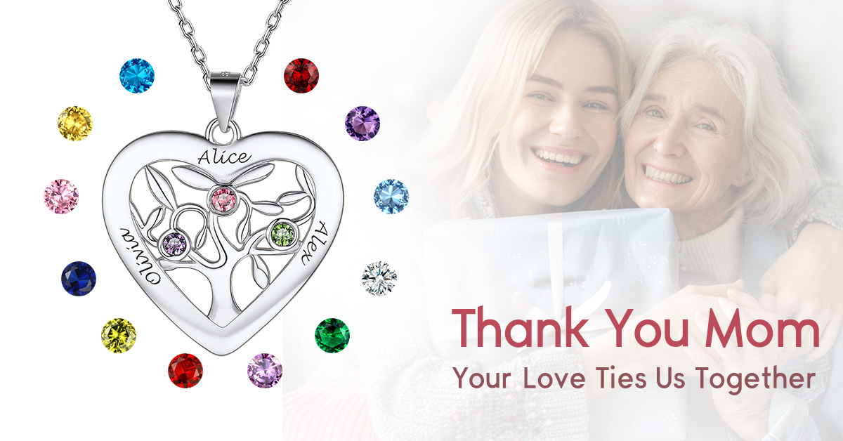 Collier Arbre de Vie Coeur Personnalisé avec Pierres de Naissance pour Maman